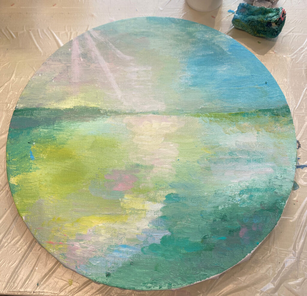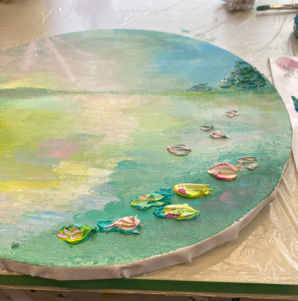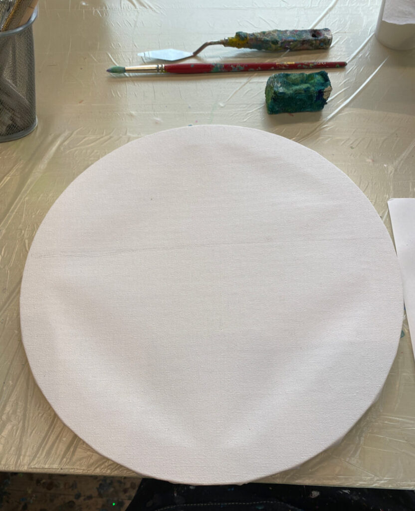 こちらの丸いキャンパスに、スポンジ・筆・ナイフで描くようです。