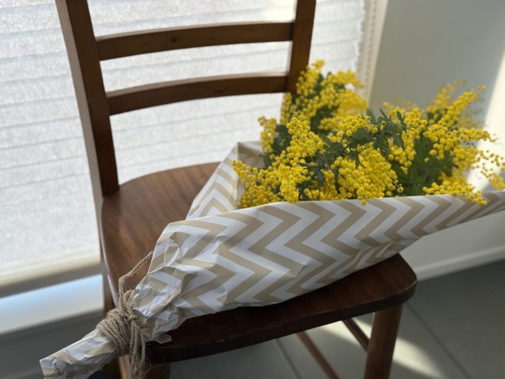 そこには、溢れんばかりのミモザを抱えた馴染みの方が、
